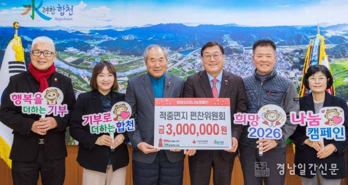 한편, 합천군은 2025년 12월 1일부터 2026년 1월 31일까지 희망2026나눔캠페인 이웃돕기 성금 집중 모금 기간을 운영하고 있으며 기탁받은 성금은 경남사회복지공동모금회를 통해 관내 어려운 이웃에 지원할 계획이다.