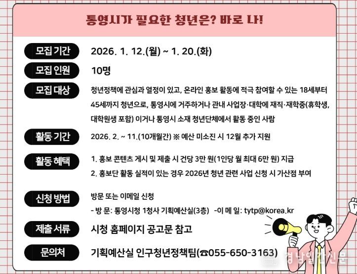 경남일간신문 | 통영시는 청년정책에 대한 이해도를 높이고 정책 참여를 확대하기 위해 '2026년 통영시 청년정책 홍보단'을 모집한다고 밝혔다.