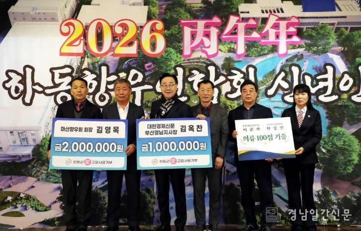 경남일간신문 | 하동군은 지난 9일 개최된 ‘전국하동향우연합회 2026년 신년인사회’에서 김영목 마산향우회장과 김옥찬 대한경제신문 부산·경남 지사장이 각각 고향사랑기부금 200만 원, 100만 원을 전달했다고 밝혔다.