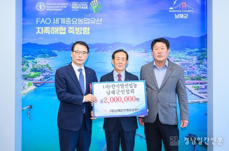 경남일간신문 | (재)남해군인재육성재단은 이철세 서면노인회 분회장, 중현떡집, 금송운수, (사)한국쌀전업농남해군연합회에서 인재육성기금을 기탁했다고 밝혔다.