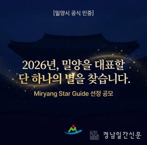 경남일간신문 | 밀양시는 관광객이 신뢰하고 선택할 수 있는 지역 대표 관광 기준을 마련하기 위해 ‘2026년 밀양 관광의 별(Miryang Star Guide)’을 공개 모집한다고 21일 밝혔다.