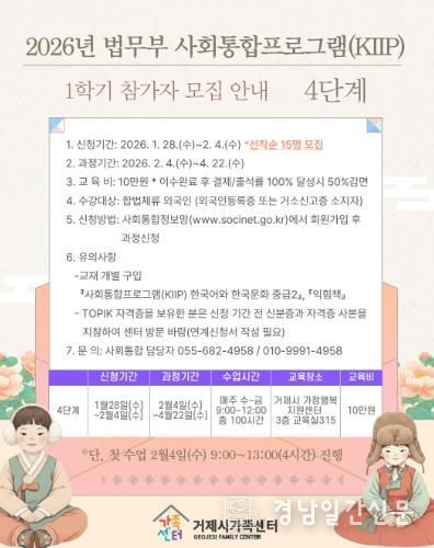 경남일간신문 | 거제시가족센터는 이민자의 안정적인 지역사회 정착과 자립을 지원하기 위해 2026년도 법무부 사회통합프로그램(Korea Immigration & Integration Program, KIIP) 1학기 참여자를 모집한다고 밝혔다.