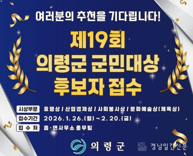 경남일간신문 | 의령군은 1월 26일부터 2월 20일까지 2026년 의령군 군민대상 후보자 추천 접수를 실시한다고 밝혔다.