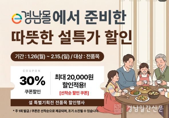 경남일간신문 | 경상남도와 (재)경상남도투자경제진흥원이 운영하는 e경남몰은 1월 26일부터 예산 소진 시까지 ‘2026년 풍성한 설맞이 할인 기획전’을 진행한다.