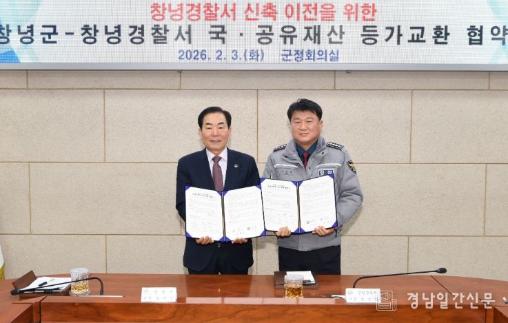 경남일간신문 | 창녕군은 3일 군청 군정회의실에서 창녕경찰서와 ‘창녕경찰서 신축 이전을 위한 국·공유재산 등가교환 협약’을 체결했다.