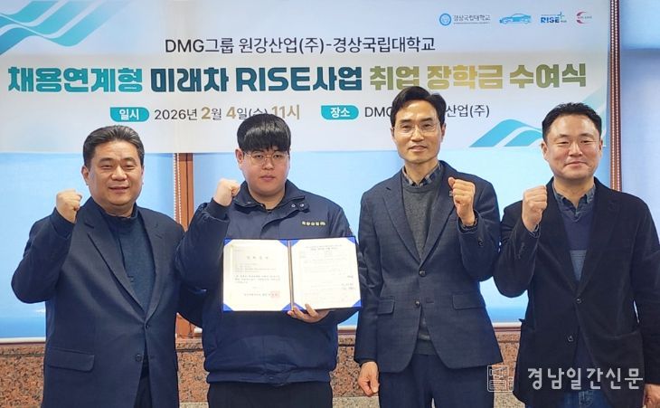 경남일간신문 | 경상국립대학교는 2월 4일 오전 11시 함안군에 소재한 원강산업(주) 회의실에서 ‘채용연계형 미래차 RISE사업 취업 장학금 수여식’을 개최했다.