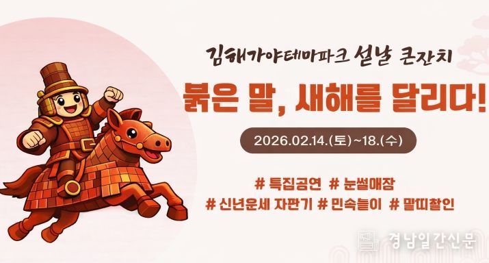 경남일간신문 | (재)김해문화관광재단이 운영하는 김해가야테마파크가 오는 2월 14일부터 18일까지 설날 특집 행사 ‘붉은 말, 새해를 달리다’를 개최한다.