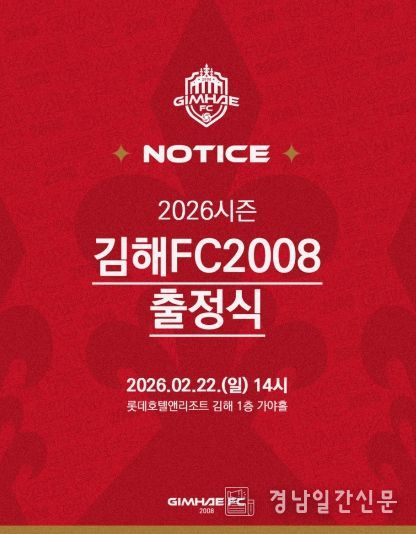 경남일간신문 | K리그2 무대에 첫 도전장을 내미는 김해FC2008(이하 김해FC)이 오는 22일 오후 2시, 롯데호텔앤리조트 김해에서 ‘2026시즌 출정식’을 개최한다.