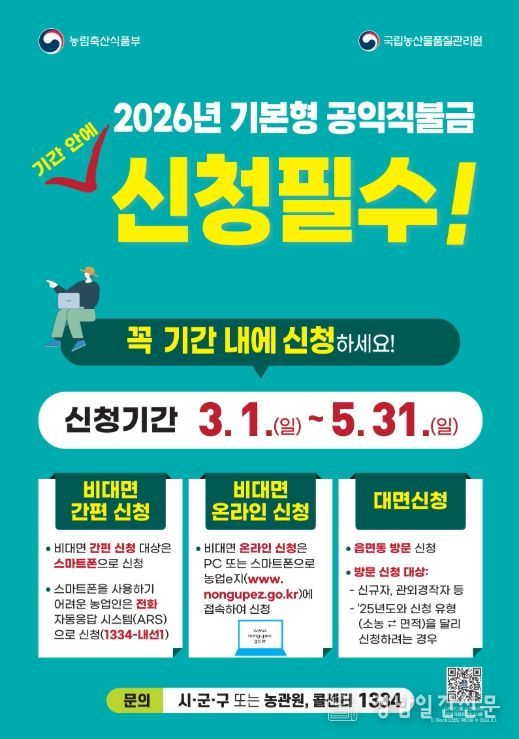 아울러 신청 전 농지대장 및 농업경영체 등록정보를 반드시 확인하고, 변동사항이 있는 경우 국립농산물품질관리원에 방문해 농업경영체 등록정보를 변경해야 한다.