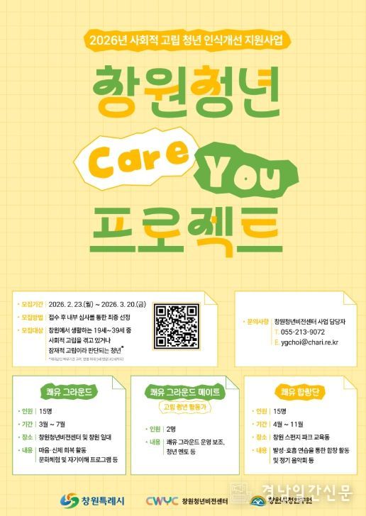 경남일간신문 | 창원특례시 창원청년비전센터는 사회적 고립 청년의 건강한 사회 복귀를 돕기 위해 ‘2026년 창원 청년 쾌유(Care-you) 프로젝트’ 참여자를 2월 23일부터 3월 20일까지 모집한다.