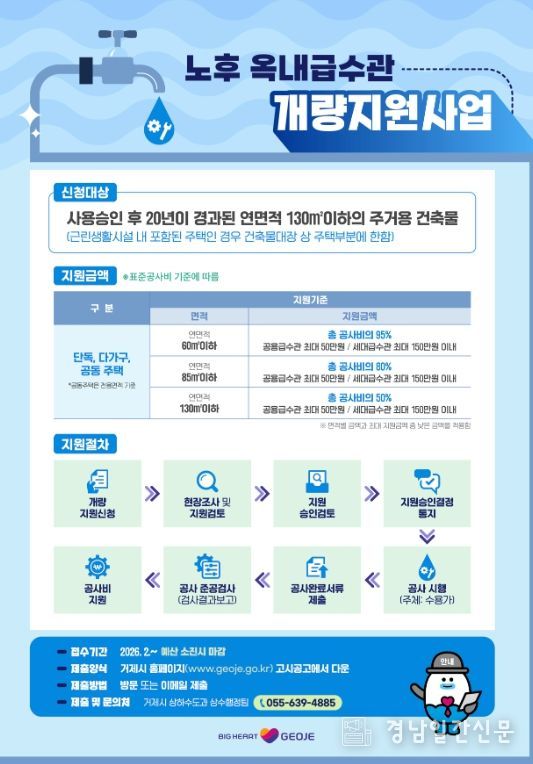 경남일간신문 | 거제시는 깨끗하고 안정적인 수돗물 공급을 위해 “노후 옥내급수관 개량지원사업”을 시행한다고 밝혔다.