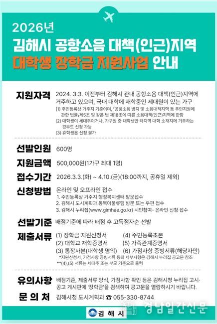 경남일간신문 | 김해시는 김해공항 소음대책(인근)지역 대학생을 대상 장학금 지원사업을 확대 시행한다고 밝혔다.