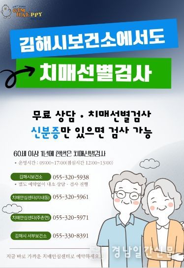 경남일간신문 | 김해시는 김해시보건소에서도 치매선별검사를 받을 수 있다고 6일 밝혔다.