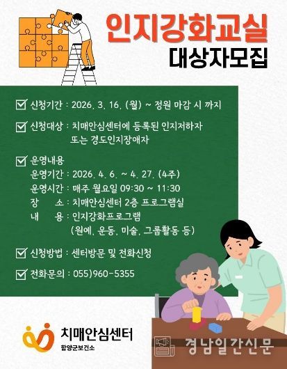 경남일간신문 | 함양군보건소 치매안심센터는 치매 고위험군을 대상으로 ‘2026년 인지강화교실 프로그램’ 참여자를 모집한다고 밝혔다.