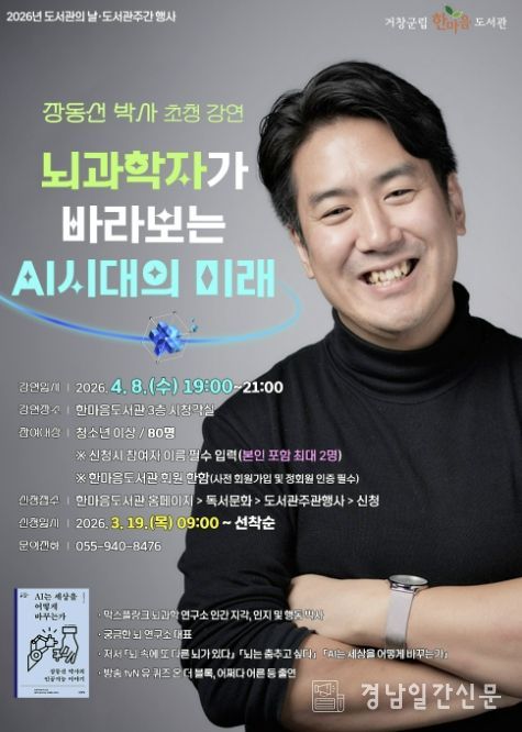 경남일간신문 | 거창군은 2026년 ‘도서관의 날·도서관 주간’을 맞아 한마음도서관에서 군민들이 도서관의 가치를 되새기고 다양한 문화를 향유할 수 있도록 강연, 공연, 체험활동 등이 어우러진 기념행사를 개최한다.