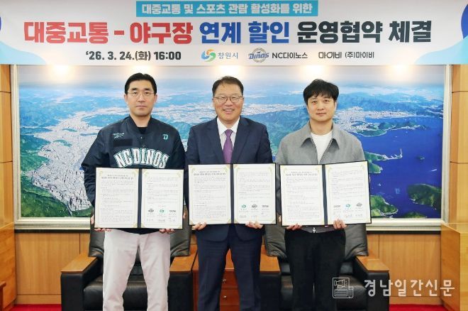 경남일간신문 | 창원특례시와 NC 다이노스, ㈜마이비는 24일 창원시청에서 시내버스-야구장 연계 할인 서비스 제공을 위한 업무협약을 체결했다.