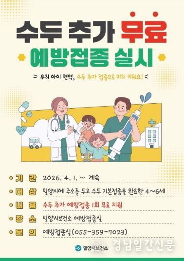 경남일간신문 | 경남 밀양시는 봄철 수두 유행에 대응해 아동 건강 보호를 위해 전국 최초로 수두 추가 예방접종 사업을 시행한다고 25일 밝혔다.