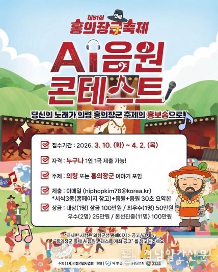 경남일간신문 | 의령군은 오는 4월 16일 개막하는 ‘제51회 의령 홍의장군 축제’를 앞두고, 생성형 AI 기술을 활용한 전국 단위 음원 콘테스트를 개최한다고 밝혔다.