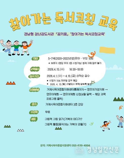 경남일간신문 | 거제시육아종합지원센터는 오는 4월 15일, 거제시 관내 5~7세 영유아 자녀를 둔 가정을 대상으로 ‘찾아가는 독서코칭 교육’을 실시한다.