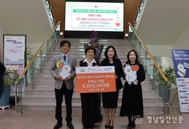 김해시는 8일 시청에서 가야당커피 장윤정 대표, 월드비전 경남울산본부 관계자가 참석한 가운데 취약계층 아동 주거환경 개선 지원을 위한 성금 기탁식을 가졌다고 밝혔다.