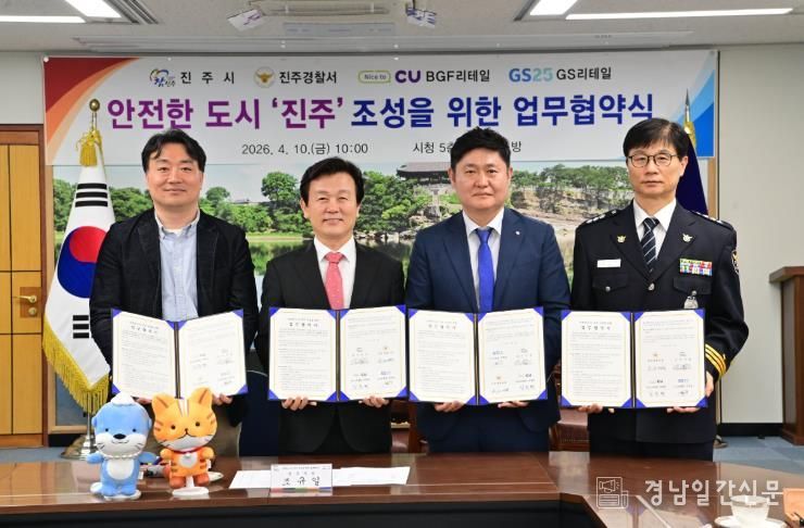 경남일간신문 | 진주시는 10일 아동 대상 범죄 예방과 안전한 등하굣길을 조성하기 위해 경찰서와 편의점(CU, GS25)과 함께 ‘유해환경 개선 및 안전한 도시 조성을 위한 업무협약(MOU)’을 체결했다고 밝혔다.
