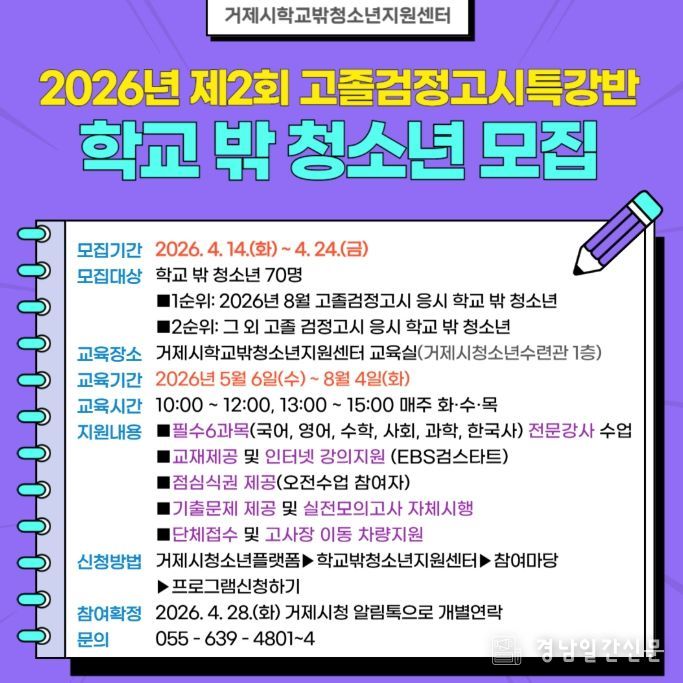 경남일간신문 | 거제시학교밖청소년지원센터에서는 2026년도 제2회 고등학교 졸업학력 검정고시 대비 검정고시특강반에 참석할 학교 밖 청소년을 모집한다.