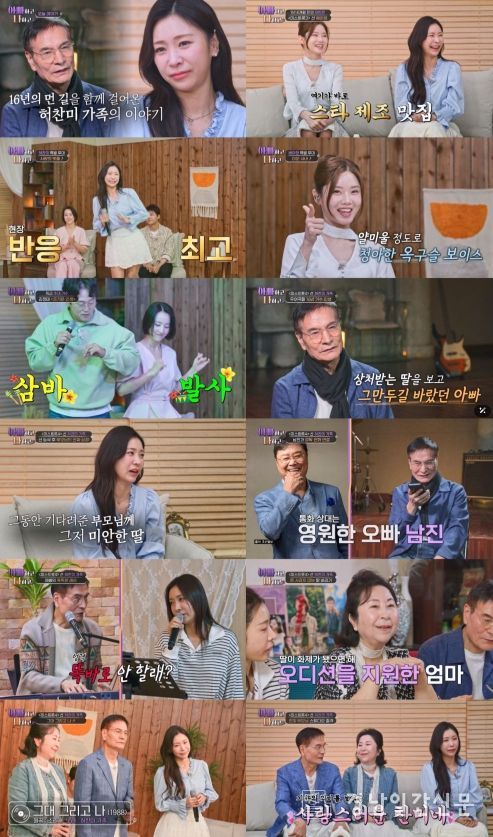 한편, 허찬미 가족은 경연을 응원해 준 ‘든든한 지원군’ 허찬미 이모와 허찬미 아버지의 제자인 가수 박우철, 허준을 초대해 화려한 한 상을 대접했다. 허찬미는 몸을 사리지 않으며 딸을 응원한 부모님과 든든한 지원군에게 고마운 마음을 표현했다. 특히 경연에 출전한 딸과 아내의 매니저 역할 때문에 체중시 4kg 빠지며 기다림 전문이 된 허찬미 아버지는 “기다리는 건 사귈 때부터 몇 시간이고 기다렸다”며 연애 시절을 회상했다. 허찬미 부모님은 음악을 하다 만나게 됐지만, 허찬미 아버지는 장인어른이 “딴따라와는 결혼 못 시킨다”라며 목회를 권유하자 사랑을 위해 가수의 꿈을 버리고 목사의 길을 걸었다. 남편의 꿈을 되찾아주고 싶었던 허찬미 어머니는 결혼 5년 만에 ‘둘바라기’라는 듀엣 그룹으로 함께 음반을 발매하며 꿈을 이뤘다. 허찬미 아버지는 “가수 안 된 거 절대 후회 안 하는데, 집사람은 가수 못 시킨 게 후회가 되고 안타깝다. 늘 미안하다”고 자신의 꿈보다 아내 걱정을 먼저 하며 눈시울을 붉혀 감동을 자아냈다. 허찬미 부모님은 부모님의 꿈을 이어받은 딸이 꿈을 포기하지 않고 이어가길 응원했고, 드라마 같은 이야기에 스튜디오는 “현실에 있는 가족 같지 않다”며 감동했다. 딸 덕분에 스튜디오를 찾은 허찬미 부모님은 딸과 함께 소리새의 ‘그대 그리고 나’를 함께 열창하는 무대로 미처 이루지 못했던 가수의 꿈을 펼쳐내며 특별한 순간을 함께 했다.