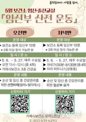 경남일간신문 | 보건소는 임신부의 건강 증진과 안전한 출산 준비를 지원하기 위해 오는 5월 ‘임신·출산교실(임신부 산전운동 교실)’을 운영할 예정이며, 4월 20일 오전 9시부터 참가자를 선착순으로 모집한다.