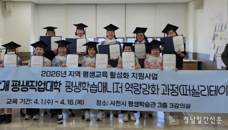경남일간신문 | 사천시 평생학습관은 지역 평생교육 현장에서 활동할 전문 인력을 양성하기 위해 운영한 '평생학습매니저 역량강화 과정'을 성공적으로 마무리했다고 17일 밝혔다.