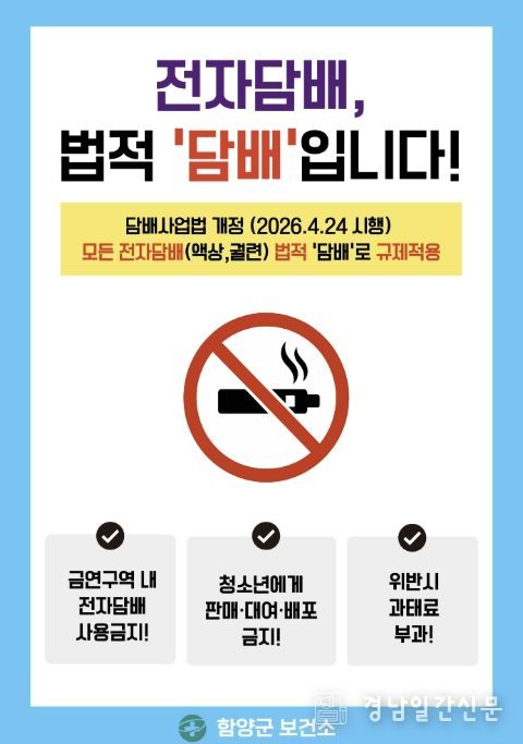 경남일간신문 | 함양군 보건소는 전자담배를 포함한 모든 담배 제품의 금연구역 내 사용을 규제하는 '담배사업법' 개정에 따라 오는 4월 24일부터 5월 15일까지 집중 점검을 실시한다고 밝혔다.
