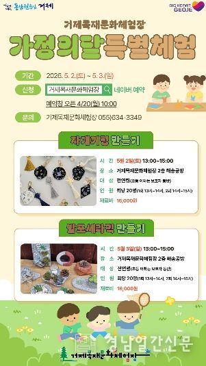 경남일간신문 | 거제시 목재문화체험장(동부면 거제중앙로 325, 거제자연휴양림 내 위치)은 가정의 달을 맞아 오는 5월 2일과 5월 3일 이틀간 『자개키링&발포세라믹 만들기 특별체험』을 운영한다고 밝혔다.
