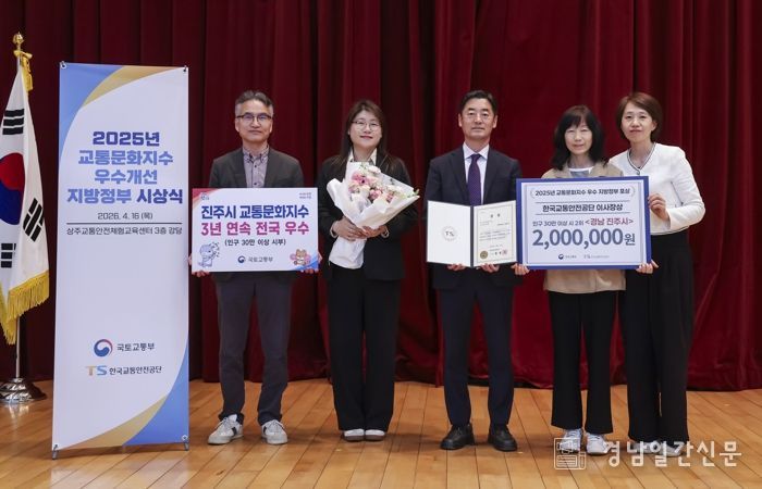 경남일간신문 | 진주시는 지난 16일 국토교통부가 주최한 ‘2025년 교통문화지수 우수 지자체 시상식’에서 인구 30만 명 이상의 시부 그룹에서 전국 2위를 차지해 3년 연속 우수 지자체로 선정돼 기관 표창을 받았다고 밝혔다.