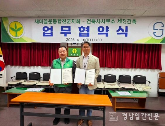 경남일간신문 | 새마을운동합천군지회(회장 정성철)와 건축사사무소 세진건축(대표 김세환)은 16일 새마을지회 회의실에서 군 및 읍·면 남녀 회장 40명이 참석한 가운데 업무협약식을 개최했다.