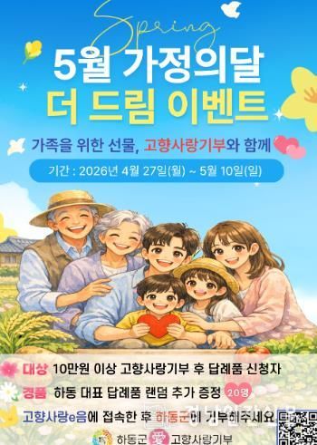 경남일간신문 | 하동군이 5월 가정의 달을 맞아 4월 27일부터 5월 10일까지 ‘고향사랑기부 더 드림 이벤트’를 진행한다.