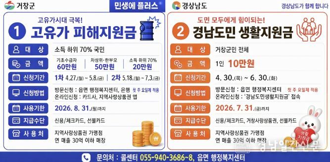경남일간신문 | 거창군은 장기화되고 있는 고유가와 경제침체에 어려움을 겪는 군민들의 생활안정을 위해 ‘고유가 피해지원금’과 ‘경남도민 생활지원금’을 지급한다.