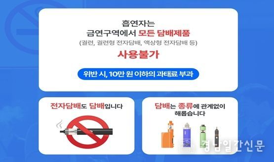 이번 개정의 주요 내용은 담배의 정의가 기존 연초에서 니코틴을 원료로 한 제품까지 확대된 것으로, 전자·액상형 담배 등도 포함돼 금연구역 내 사용이 금지된다. 위반 시 과태료 10만 원이 부과된다.