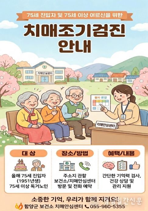 경남일간신문 | 함양군 치매안심센터는 고령 주민의 건강한 일상 유지를 위해 75세 진입자와 75세 이상 독거노인을 대상으로 치매 조기 검진을 적극적으로 권고하고 있다고 밝혔다.