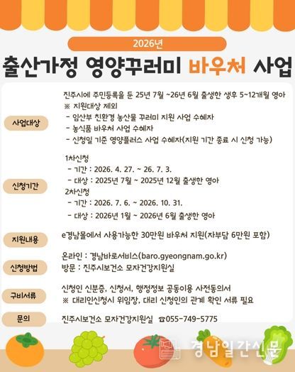 경남일간신문 | 진주시보건소는 출산 가정의 경제적 부담을 덜고 영아의 건강한 성장과 발달을 지원하기 위해 2026년 신규사업인 ‘출산가정 영양꾸러미 바우처(Voucher) 지원사업’을 오는 27일부터 시행한다고 밝혔다.