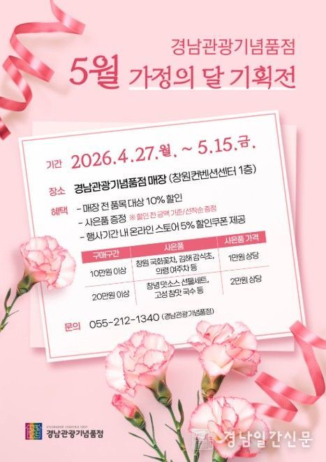 김상원 경남도 관광개발국장은 “가정의 달을 맞아 경남의 우수한 관광기념품이 소중한 분들께 전해지는 따뜻한 선물이 되길 바란다”며 “이번 기획전이 지역 경제 활성화와 관광산업 경쟁력 강화에 기여하는 계기가 되길 기대한다”고 밝혔다.