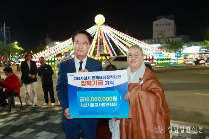 (재)사천시인재육성장학재단은 지난 25일 5호 광장 교차로(삼천포농협로타리)에서 열린 ‘불기 2570(2026)년 부처님 오신 날 봉축탑 점등법회’ 현장에서 사천시불교사암연합회가 장학금 1,000만 원을 기탁했다고 28일 밝혔다.