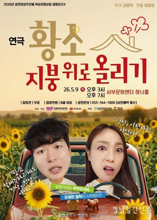경남일간신문 | (재)김해문화관광재단 김해서부문화센터는 경남문화예술진흥원이 주관하는 ‘2026 공연장상주단체 육성지원사업’에 선정되어, 오는 5월 9일 두 번째 레퍼토리 공연 연극 '황소, 지붕위로 올리기'를 선보인다.