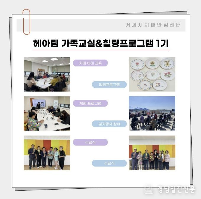 경남일간신문 | 거제시치매안심센터는 치매 대상자 가족 지원을 위해 3월부터 4월까지 8주간 ‘헤아림 가족교실’과 ‘힐링프로그램’ 1기를 성공적으로 운영하고 지난주 수료식을 개최했다.
