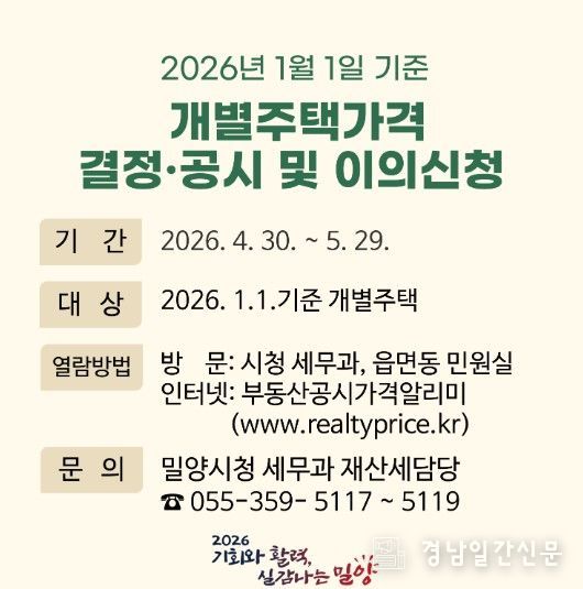 경남일간신문 | 경남 밀양시는 2026년 1월 1일 기준 개별주택 2만 7,525호에 대한 주택가격을 오는 4월 30일 결정·공시하고, 5월 29일까지 이의신청을 접수한다고 밝혔다.