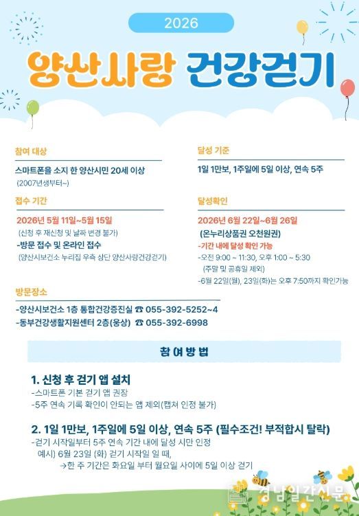 경남일간신문 | 양산시는 시민들의 신체활동 증진과 건강한 생활습관 형성을 위해 ‘양산사랑 건강걷기’사업의 2차 접수를 5월 11일부터 5월 15일까지 진행한다고 밝혔다.