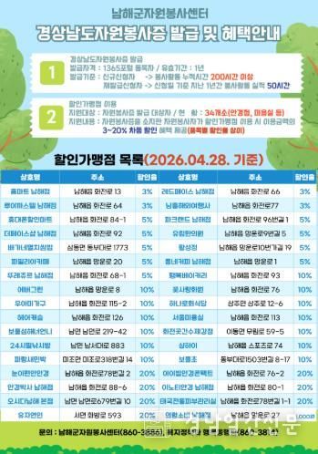 경남일간신문 | 남해군은 경상남도 자원봉사증 발급자를 대상으로 제공되는 할인가맹점 혜택을 확대하기 위해 관내 할인가맹점 10개소를 추가했다고 밝혔다.