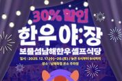 경남일간신문 | 남해군은 연말을 맞아 오는 12월 17일부터 20일까지 4일간, 매일 오후 5시부터 9시까지 남해축협 본소 주차장에서 ‘한우야:장(보물섬남해한우 셀프식당)’을 운영한다고 밝혔다. 이번 행사는 얼마 전 군민과 상인들의 뜨거운 호응 속에 마무리된 ‘남해의 맛 – 화전야:장(花田夜:場)’의 열기를 이어받아 군민들에게 겨울밤, 야외 테이블에서 프리미엄 한우 코스를 즐길 수 있는 특별한 경험을 제공하기 위해 마련됐다. 행사 기간 동안 마트에서 100g당 17,000원~13,100원에 판매되는 1++, 1+ 등급 보물섬남해한우(등심, 안심 및 특수부위)를 30% 할인된 가격으로 현장에서 구워 먹을 수 있다. 한편, 예로부터 우리 민족은 겨울철에 쇠고기를 즐겨 먹었는데 음력 10월이면 숯불을 지핀 화로에 번철을 놓고 양념한 쇠고기와 여러 재료를 함께 구워 둘러앉아 나누던 풍속인 난로회(煖爐會)가 있었으며, '열하일기'를 집필한 연암 박지원은 “겨울철 눈 오는 날, 친구를 불러 고기를 구워 먹으니 신선이 사는 곳이 부럽지 않다”고 기록했다.