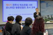 경남일간신문 | 진주시는 24일 시청 3층 문화강좌실에서 ‘2025년 미소친절 시민모니터단 교육’을 실시해 친절행정 실현에 앞장서고 있다. 이번 교육에는 미소친절 시민모니터단 25명이 참석해 모니터단의 역할과 평가체계를 이해하고, 읍면동 민원현장의 친절서비스 개선을 위한 암행 모니터링 방법 등 실무중심의 교육이 진행됐다. 또한 시민이 만족하는 친절행정 실현을 위한 의견 교환도 활발히 이뤄졌다. 미소친절 시민모니터단의 조사 결과는 올해 상·하반기 2회에 걸쳐 실시한 전화 친절도 평가 점수와 합산해 연말 읍면동 종합평가에 반영될 예정이다. 한편 진주시 미소친절 시민모니터단은 전 읍면동을 대상으로 ▲공무원의 친절도 ▲업무해결 노력도 ▲신속성 및 정확성 등을 시민의 눈높이에서 평가하고, 민원서비스 제도개선 의견을 제시하는 등 공무원 친절역량 강화를 위한 다양한 활동을 펼치고 있다. 장정오 민원여권과장은 “미소친절 시민모니터단은 시민의 눈높이에서 행정서비스를 살피는 소중한 파트너이다”면서 “앞으로도 시민이 체감할 수 있는 친절행정 구현을 위해 모니터단과의 소통을 강화하겠다”고 말했다. &nbs