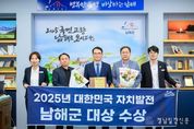 경남일간신문 | 남해군이 ‘2025 대한민국 자치발전 대상’ 기초자치단체 부문에 선정되는 영예를 안았다. 대한민국 자치발전 대상은 한국자치발전연구원이 주최하고 한국지방자치학회, 한국지역개발학회가 후원하는 상으로, 지방자치 발전과 지역 혁신에 기여한 국회의원, 지방자치단체, 지방의회 의원, 공무원, 민간 등을 격려하기 위해 매년 시행되고 있다. 남해군은 민생안정 지원금 지원 조례 제정, 빈집 정비 및 활용 조례 개정, 기업·투자유치 조례 시행규칙 개정 등 현안 해결을 위한 제도 개선을 선도적으로 추진해 지역 여건에 맞는 법적·제도적 기반을 마련해 왔다. 또한 보물섬FC 클럽하우스 조성, ‘국민고향 남해 방문의 해’ 추진 등 지역 특성을 살린 독창적인 정책과 더불어 교육자치, 주민자치 캠페인, 군민 맞춤형 복지정책 등을 통해 다양한 분야에서 모범적인 성과를 거둔 점을 높이 평가받았다. 장충남 남해군수는 “이번 수상은 지방자치 30주년을 맞아 더욱 뜻깊은 결과”라며 “군민과 함께 추진해 온 정책이 전국적으로 인정받은 만큼, 앞으로도 군민이 체감할 수 있는 혁신 행정을 통해 지방자치를 실현해나가겠다”고 말