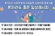 경남일간신문 | 고성군은 10월 2일부터 13일까지 고성군종합사회복지관에서 독거노인 어르신을 대상으로 독거노인 자립 및 사회관계 형성 프로그램 ‘혼자라도 좋은 일상레시피’ 참여자를 모집한다. ‘혼자라도 좋은 일상레시피’ 프로그램은 정서적 안정, 사회적 관계 형성 및 자립 역량 강화를 통해 독거 노인의 건강한 일생생활 도모 기회를 제공하고자 매주 수요일 △공예체험 △천연아로마체험 △요리교실 △신체활동 △미술심리(만다라) △디지털 교육 등 다양한 주제로 10월 15일부터 12월 3일까지 총 8회기 진행될 예정이다. 신청 대상은 고성군에 거주하는 홀로 지내시는 어르신 누구나 참여할 수 있다. 참여 신청은 종합사회복지관 분관에 방문하거나 전화로 신청할 수 있다. 고성군 공식 밴드, 고성군종합사회복지관 홈페이지를 통해 프로그램 참여자 모집 안내를 확인 할 수 있으며 문의 사항은 고성군종합사회복지관으로 문의하면 된다.