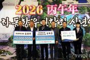 경남일간신문 | 하동군은 지난 9일 개최된 ‘전국하동향우연합회 2026년 신년인사회’에서 김영목 마산향우회장과 김옥찬 대한경제신문 부산·경남 지사장이 각각 고향사랑기부금 200만 원, 100만 원을 전달했다고 밝혔다. 이날 행사에는 황갑선 전국하동향우연합회장을 비롯한 각 지역 향우회 임원과 지역 인사들이 참석해 새해 인사를 나누고, 고향 하동의 지속 가능한 발전 방향을 논의했다. 김영목 회장과 김옥찬 지사장의 고향사랑기부는 이러한 뜻깊은 날에 의미를 더하며 함께 새해를 맞이하는 향우들의 끈끈한 연대와 우정을 보여줬다. 하승철 하동군수는 감사의 인사를 전하며 “고향사랑기부는 내 고향에 대한 마음을 전할 수 있는 소중한 수단이 되어주고 있다. 소중한 기부금을 군민들이 가장 필요한 곳에 사용하겠다”라고 말했다. 한편, 고향사랑기부제는 개인이 현재 주소지를 제외한 지방자치단체에 연간 최대 2천만 원까지 기부할 수 있는 제도이다. 10만 원 이하는 전액 세액 공제, 10만 원 초과 20만 원 이하는 44%, 20만 원 초과분에 대해서는 16.5%의 세액 공제 혜택이 주어지며, 누구든지 ‘고향사